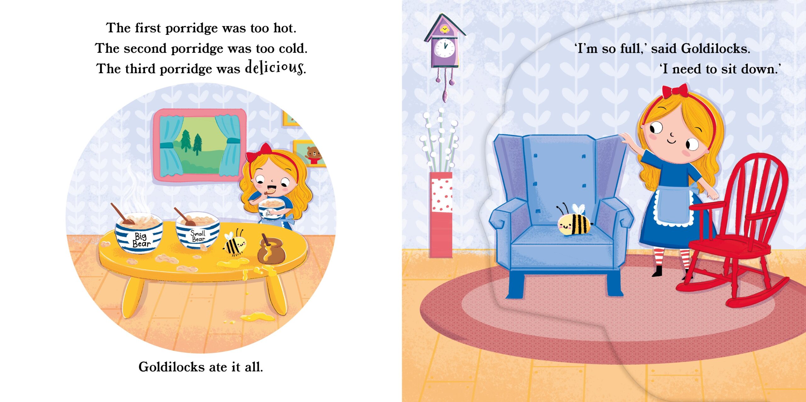 When the three bears leave for their morning walk, NAUGHTY Goldilocks sneaks into their home. She can’t resist trying their tasty porridge, sitting in their comfy chairs or taking a nap in their cosy beds. But when the bears return, how will Goldilocks explain the MESS she’s made? With fun fold-out scenes!